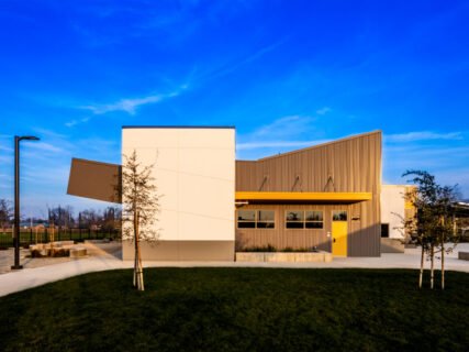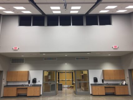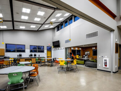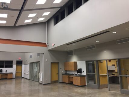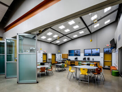 The facility features three large lab classrooms separated by folding wall systems and ample space for up to 120 students. There are two collaboration rooms that open up to the labs creating individual teaching spaces or quiet conference areas.
