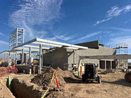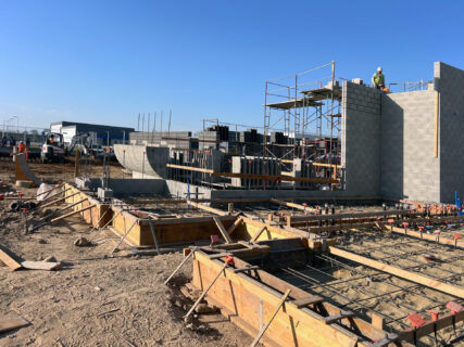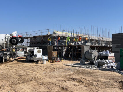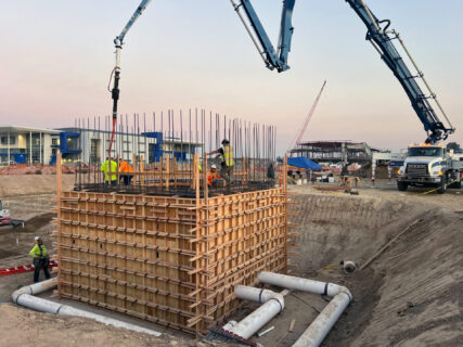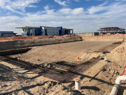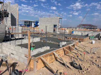 This project includes a 193’ x 90’ Myrtha California Gutter stainless steel pool with a PVC liner, surrounded by decking, landscaping, and fencing, plus parking lot expansion and a 7,000 sq. ft. pool building featuring office space, men’s and women’s locker rooms, a mechanical room, and an equipment enclosure.